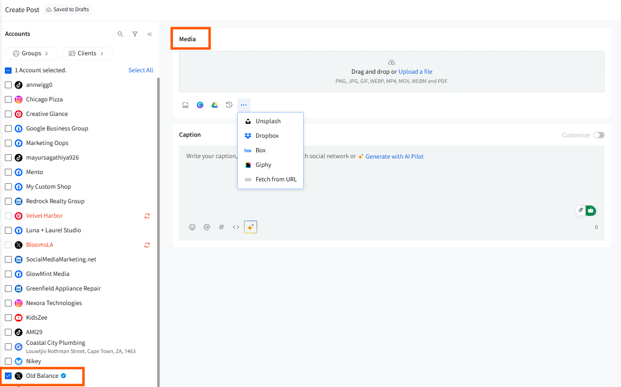 - Create an Image Post: All image uploads are available under the revamped Media section. You can now choose from multiple sources like Upload from device, Recently Uploaded (access media you added in the last 7 days), Google Drive, Dropbox, Box, Canva, Unsplash, Giphy, and Fetch from URL.