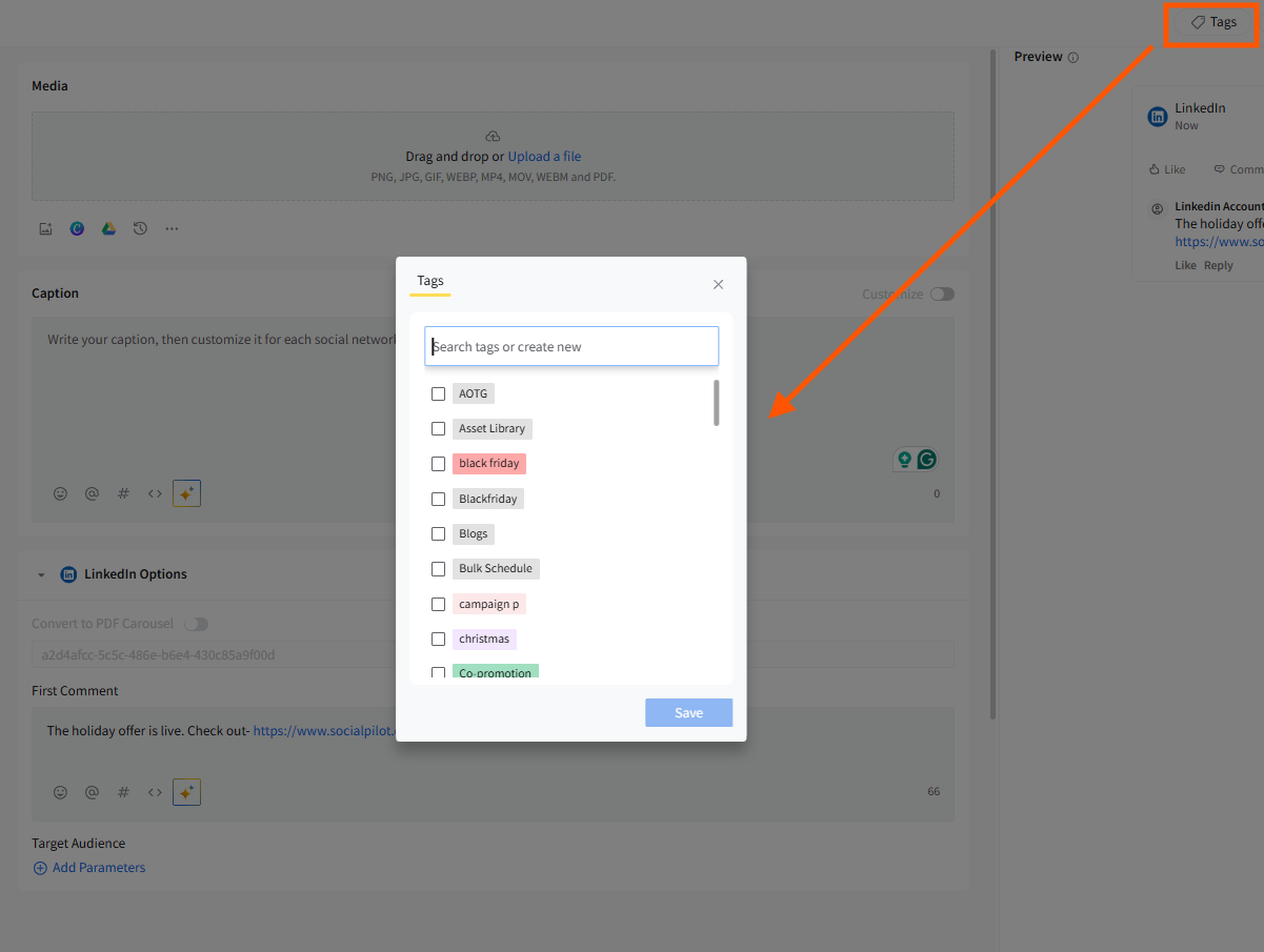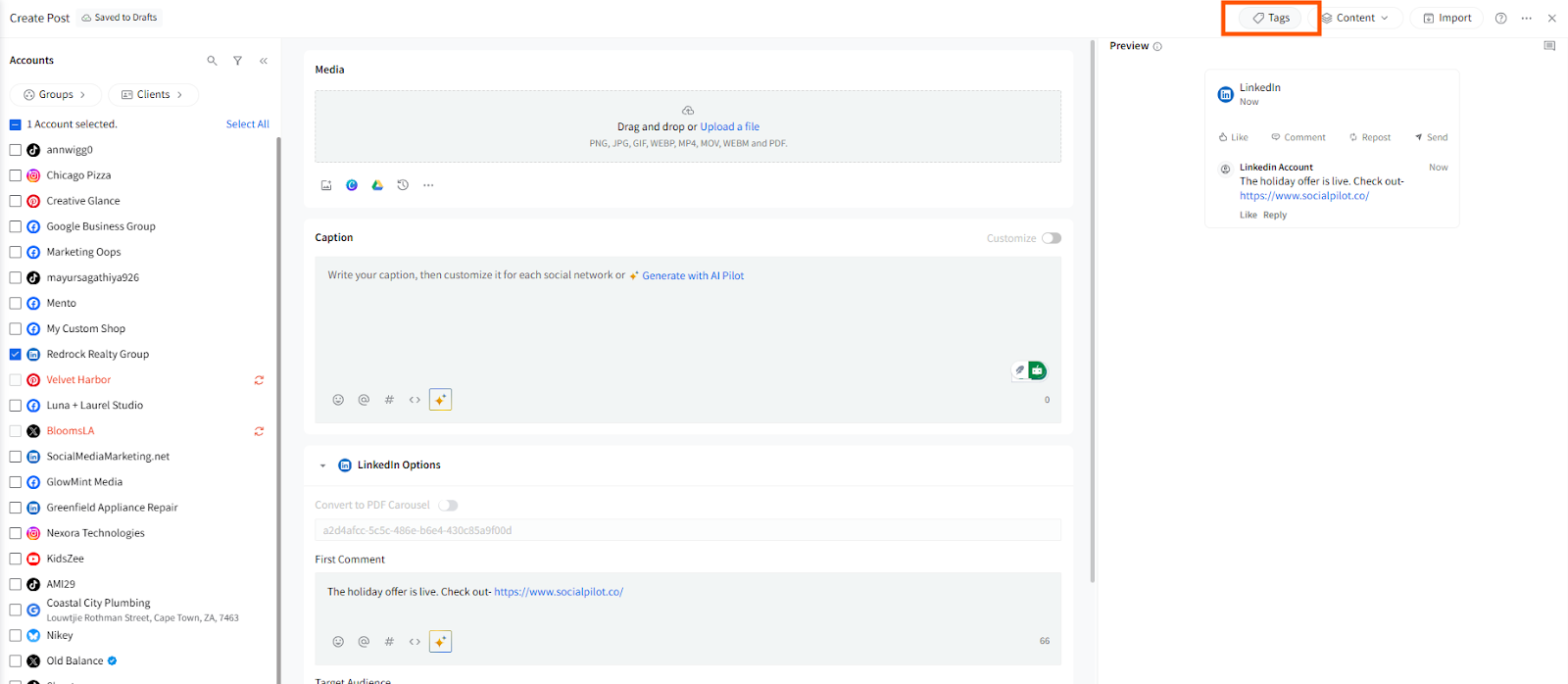 Tags help you organize your social media posts by theme, campaign, client, content type, or any internal structure that fits your workflow. In the redesigned Create Post experience, Tags are now easier to access and apply, allowing you to categorize your content at the exact moment you create it, without switching screens or disrupting your flow.