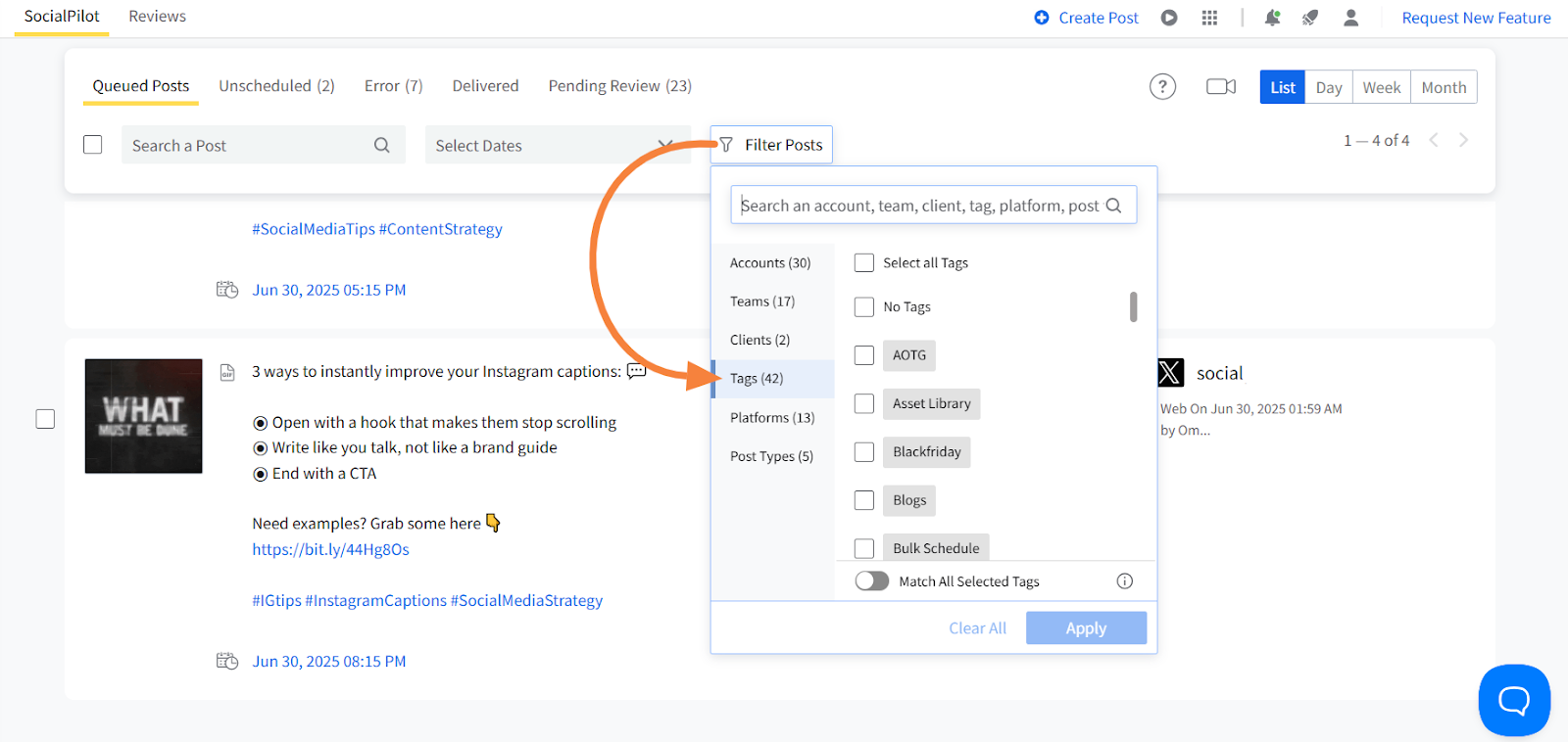 Here are the places in the SocialPilot app where you can use tags to filter content: