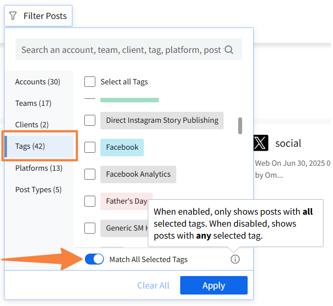 - Tags apply at the post level, meaning one set of tags is used for all selected platforms.