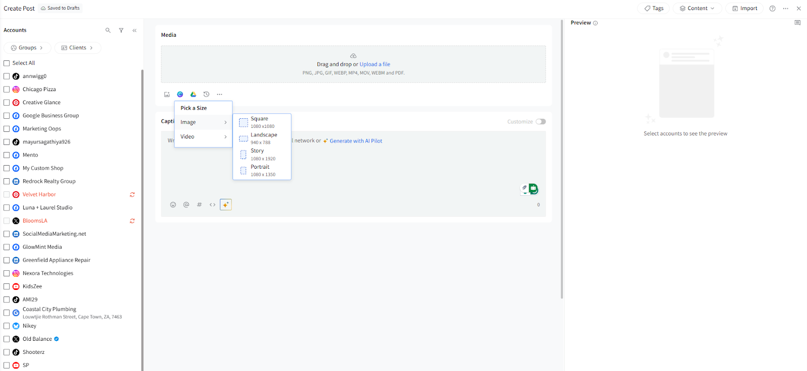 With the Canva integration, you no longer need to download and upload your creative across platforms. SocialPilot allows you to design visuals directly inside the new Create Post and add them to your post in one seamless flow.