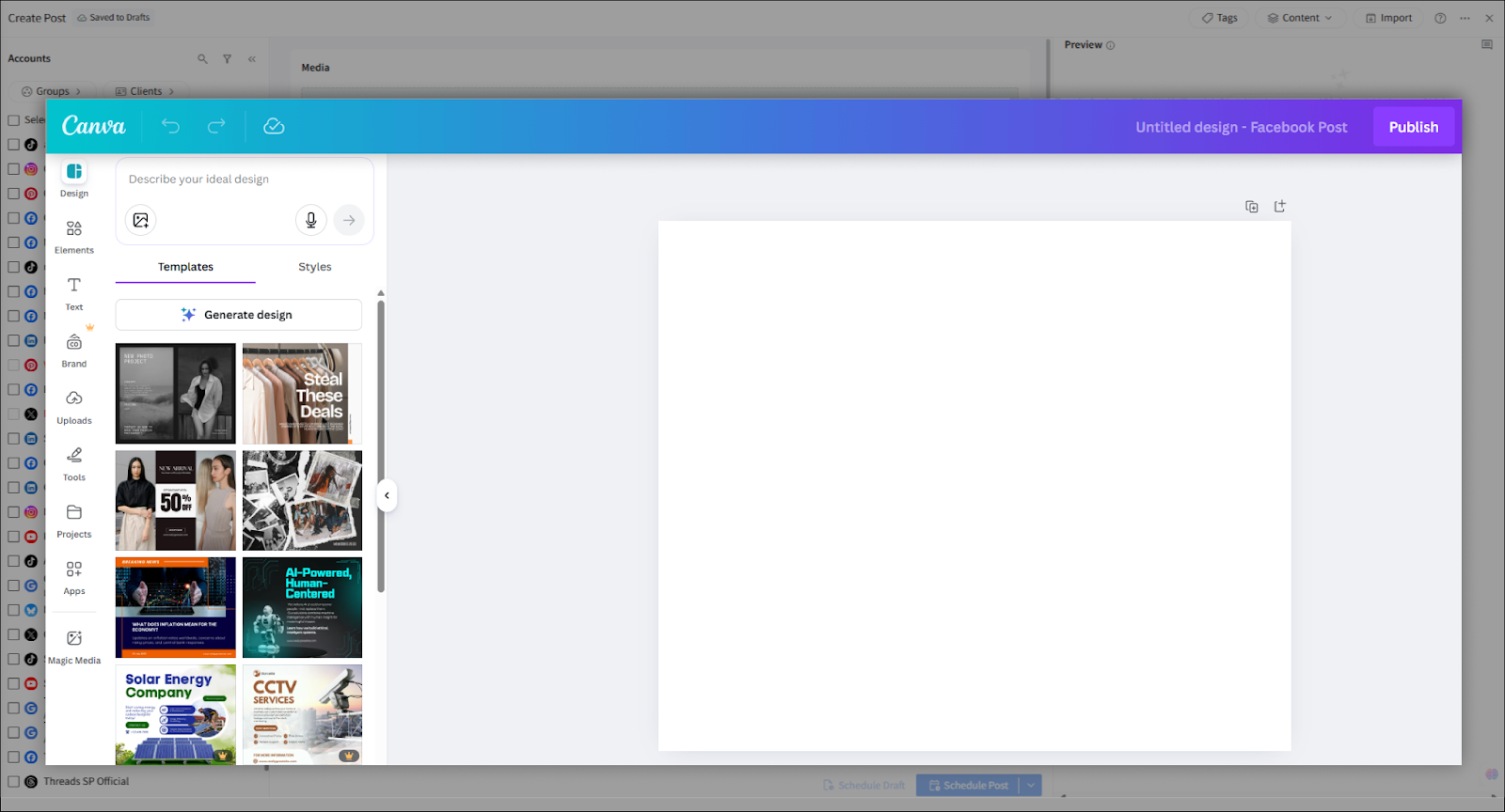 - When ready, click Publish (in Canva) to send the design directly into your SocialPilot post.