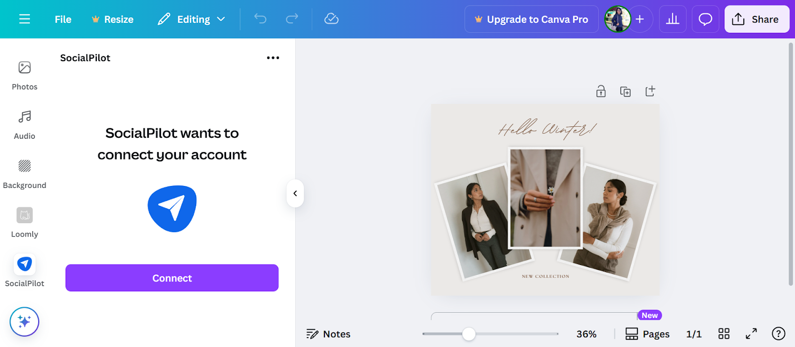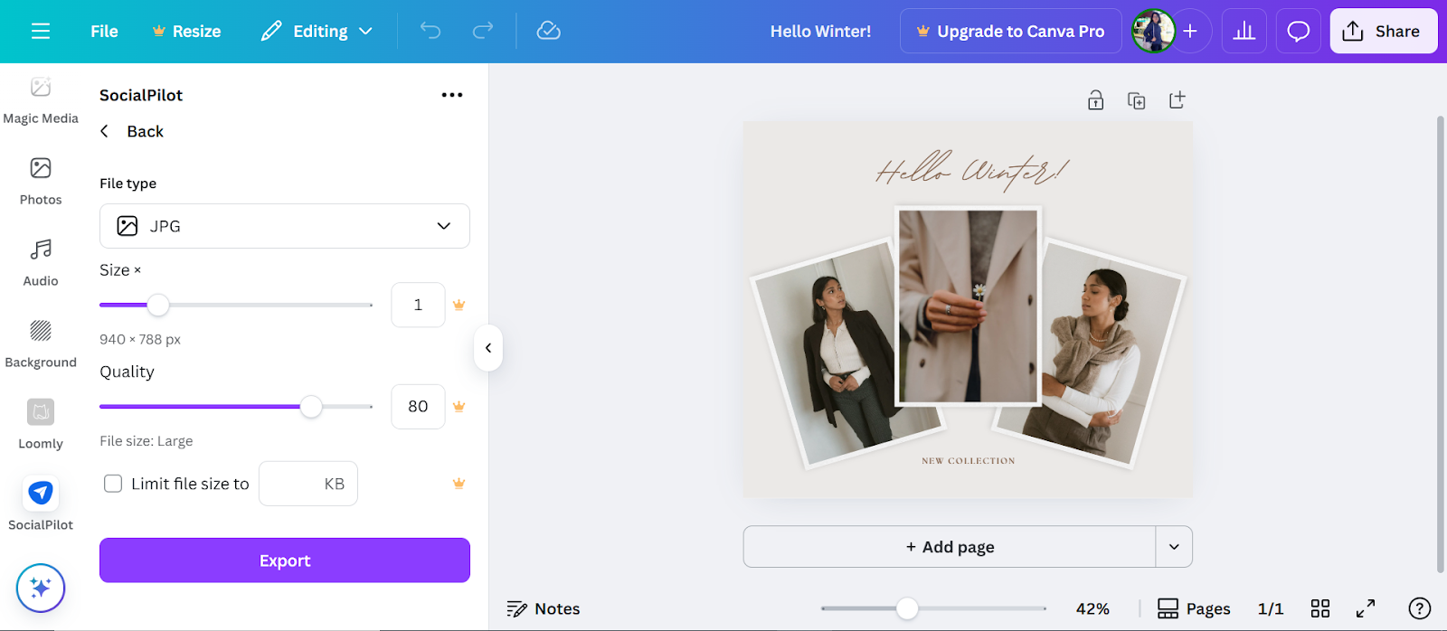 - Now, create and complete your design, and then click on the Export to SocialPilot button.