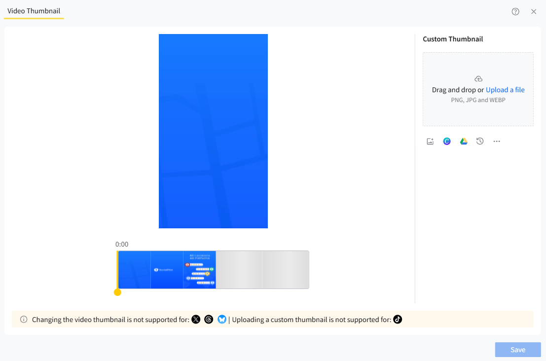 | Social Network | Type of Post | Editing thumbnail supported | From the Video Frames | Custom Thumbnail |