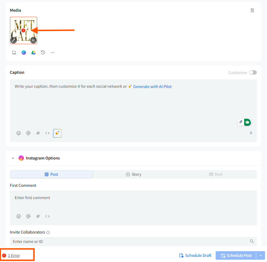 - If an uploaded image doesn’t meet the platform’s criteria, a red error indicator will appear on the image. Errors or warnings are mentioned near the scheduling buttons.