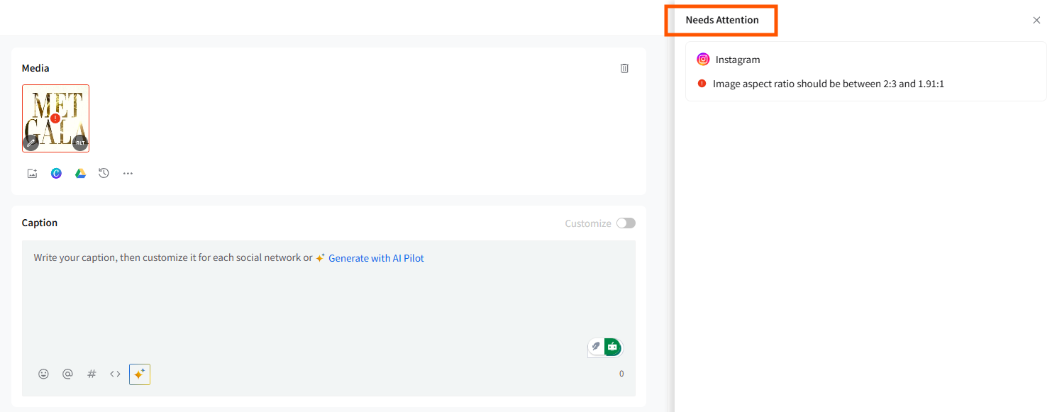 Each social media platform has unique image dimension requirements. If the images you want to schedule exceed the platform's limitations, SocialPilot automatically optimizes them to ensure your posts are published smoothly. However, if the image dimensions are incompatible with the selected platforms, SocialPilot will display an error message: “Incorrect image dimension.”