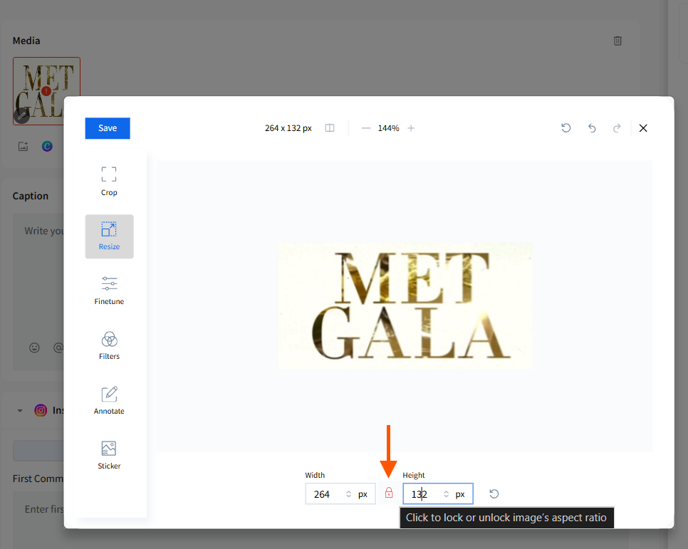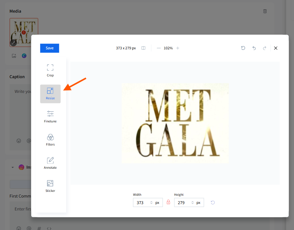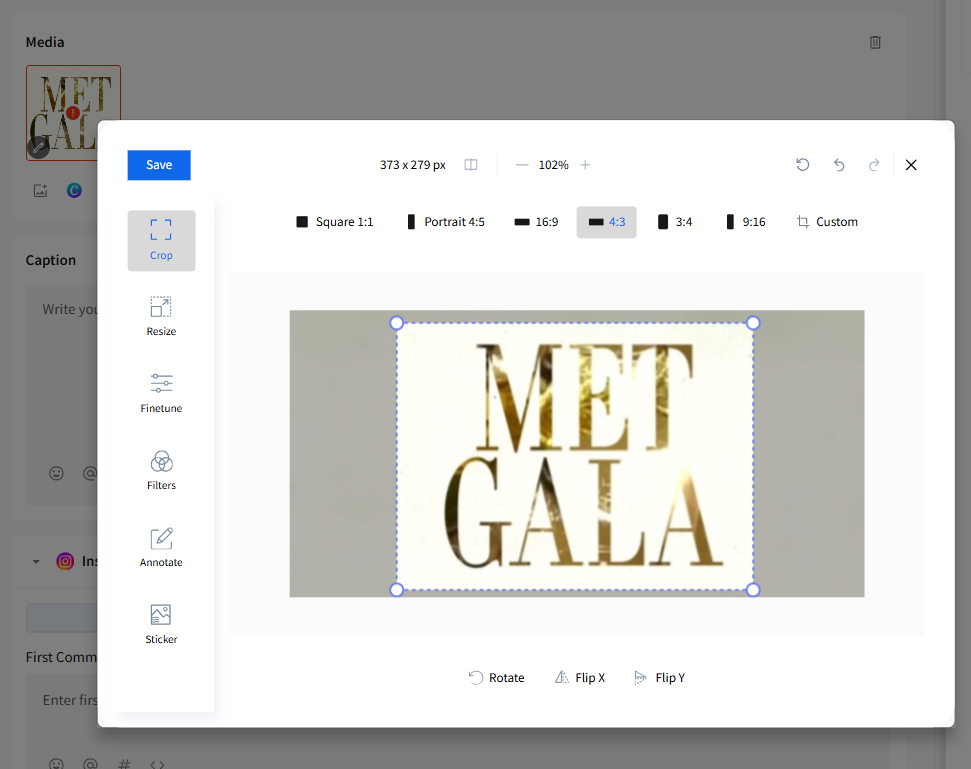 To resolve this issue, you can either resize your image to fit the platform's specifications or crop it to the appropriate aspect ratio. SocialPilot provides built-in tools for both solutions, so there's no need to use an external editor.