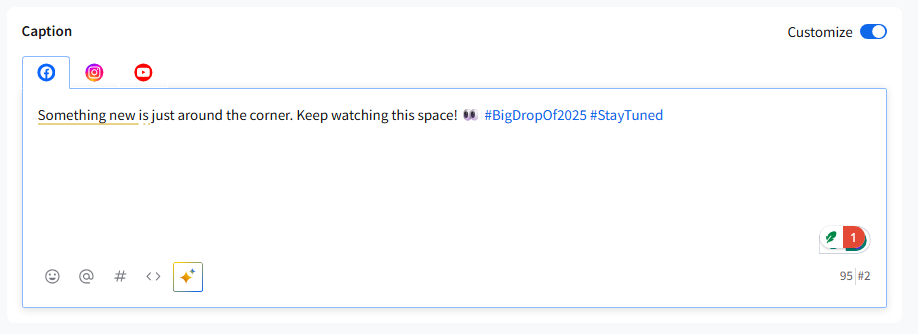 - Customization ON (Platform Tabs): Switch customization ON to open network-specific tabs. Each visible platform tab (only platforms with at least one selected account) becomes editable independently—you can change caption text, enable/disable mentions, add platform-only first comments, and toggle platform options. This creates a Custom Post for each network.