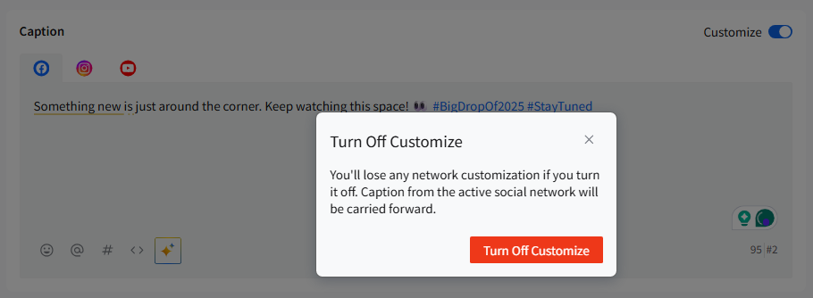 - Important: Switching from ON → OFF will remove per-network customizations (a confirmation pop-up appears before losing them) and the last customized version will become the single, original draft. Customizations saved in the Original Draft do not automatically carry over to platform tabs unless you copy them across.