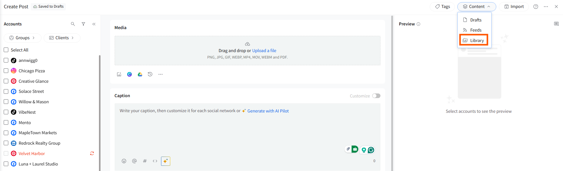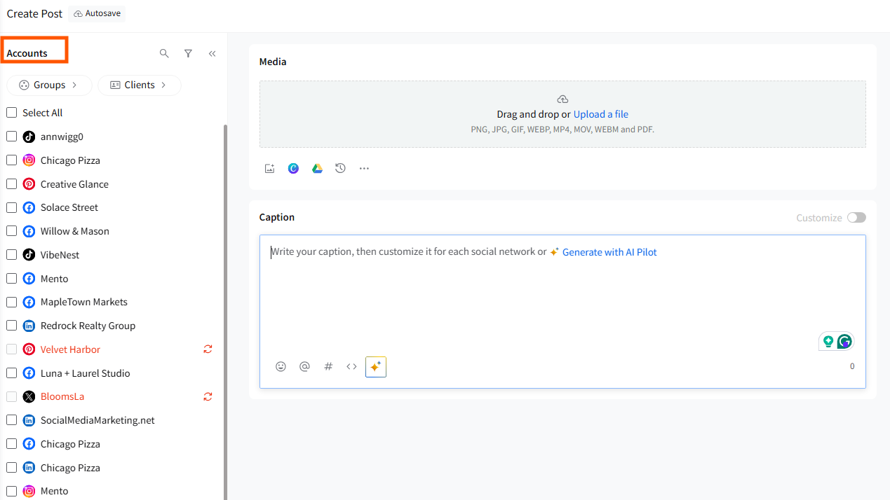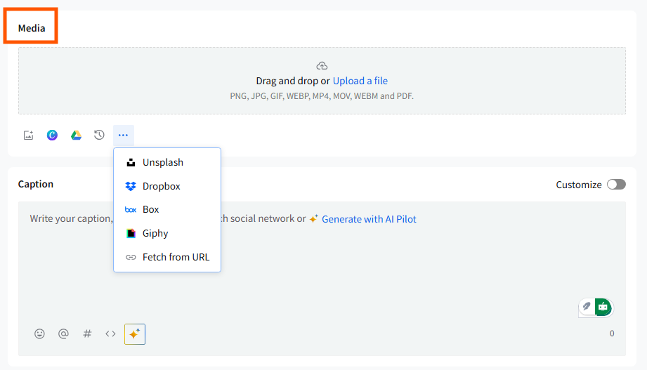 Visual content is a powerful tool for capturing attention on social media. SocialPilot allows you to easily add images to your posts, whether they are your own or sourced from a vast library of stock images. The new Create Post now has a dedicated section for Media at the top. Here’s how you can add media to your content: