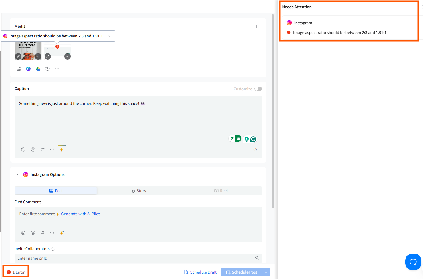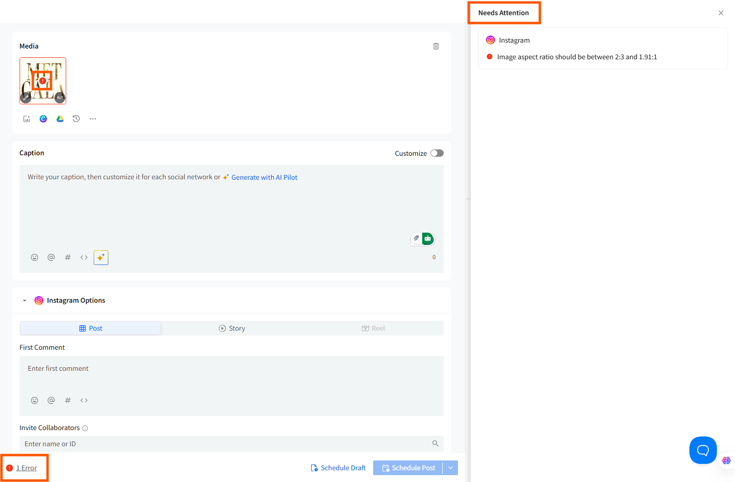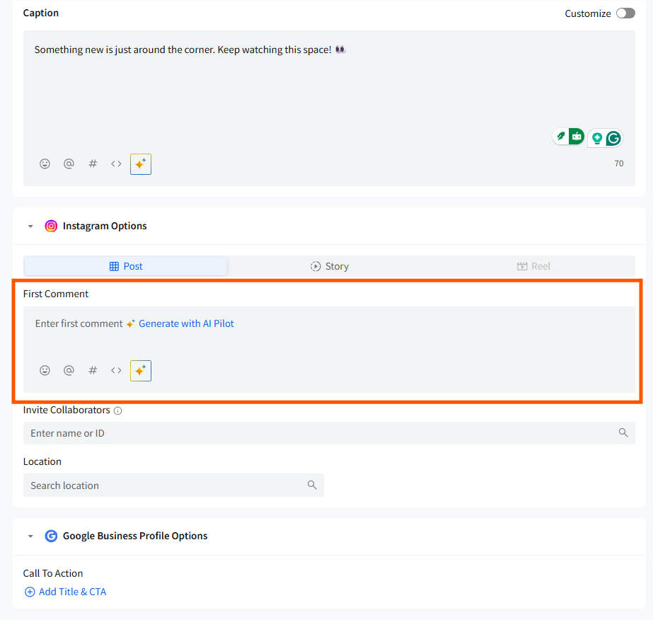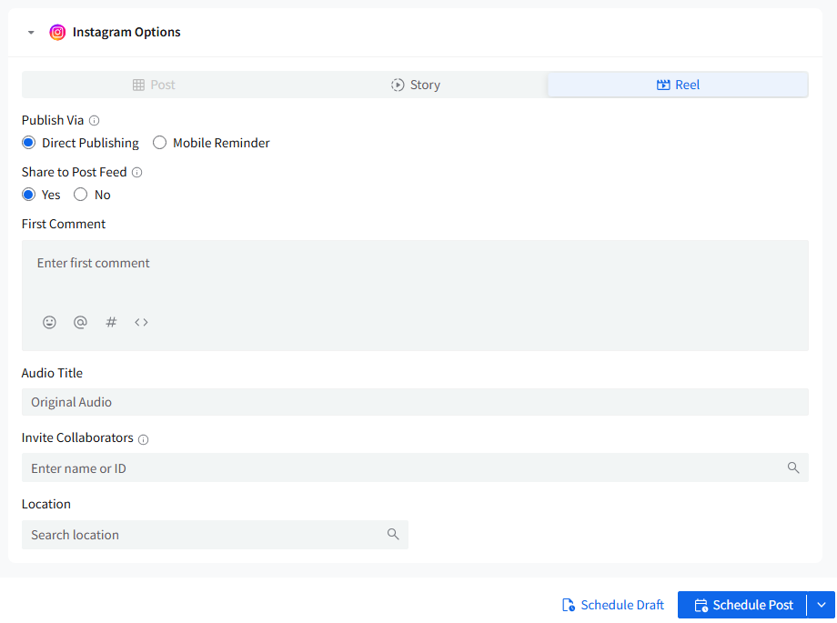- Instagram – Post, Story, and Reel, Publish via Share to Post Feed, First Comment, Audio Title, Invite Collaborators, and Location.