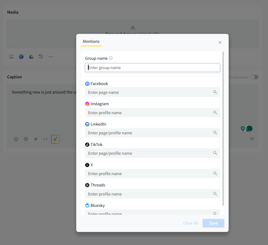 When customization is OFF, you can save sets of mentions as Mention Groups. Mention Groups make it easy to reuse and update sets of mentions. Mention Groups are created/managed from the Mention Modal and are not preserved when opening drafts in the old Create Post.