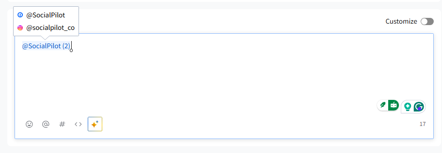 - When Customization is ON, mentions are edited per platform inside each tab and do not automatically carry to other tabs.