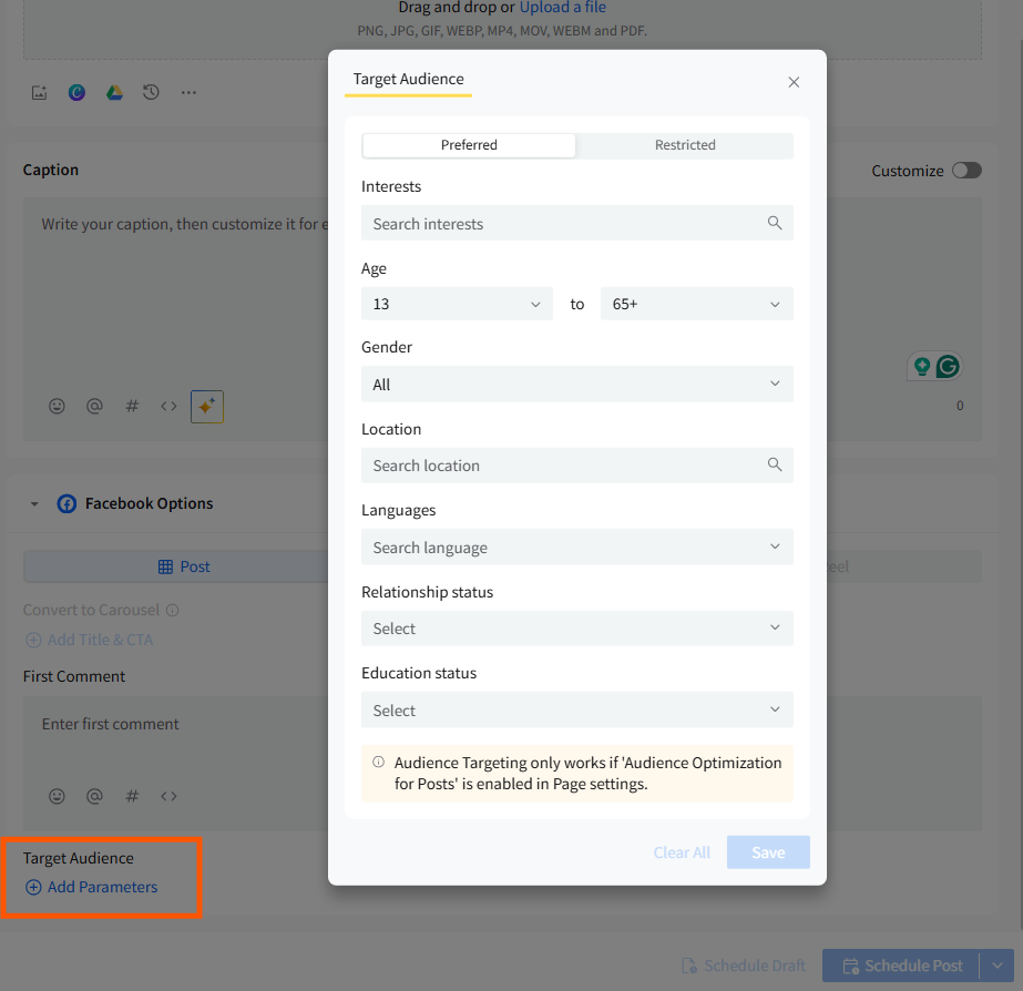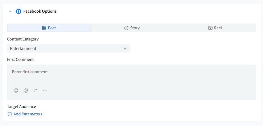 - Facebook – Post, Story, and Reel, Content Category, First Comment, Target Audience.