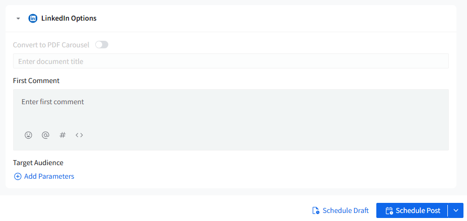 - LinkedIn – Audience targeting, First Comment, Convert to Carousel Toggle.