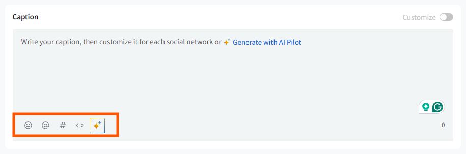 Hashtags can be added directly in the caption editor. You can type them in manually, one by one, or click the Hashtags option to choose a saved hashtag set from your Content Library and insert it into your caption with a single click.