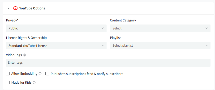 Every platform gets its own dedicated section inside Platform Options, visible only when at least one account for that platform is selected.