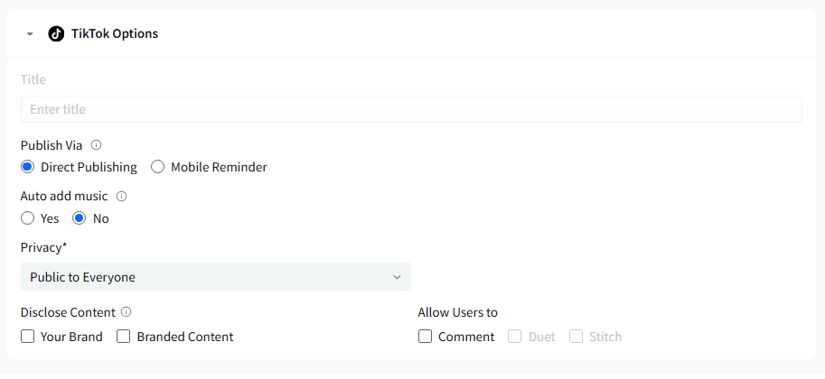 - TikTok - Title, Publish Via, Auto Add Music, Privacy, Disclose Content, Allow Users to