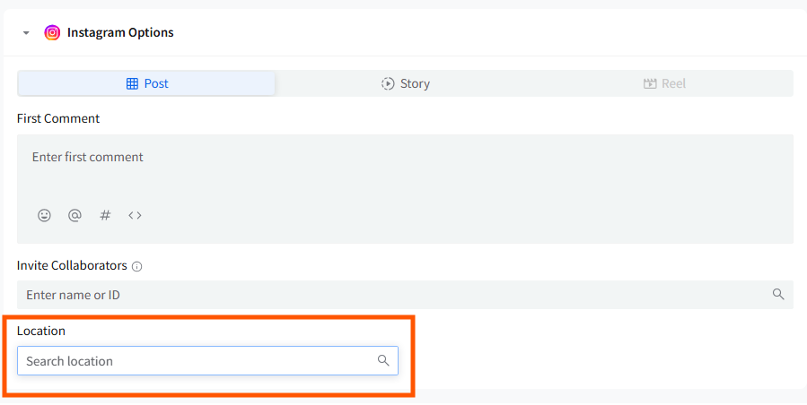 Location tags help improve the visibility of your posts among local audiences. For platforms that support location tagging, such as Instagram, you can add a location by opening the Platform Options section that appears below the caption box once the account is selected and clicking on Location to choose the appropriate location.