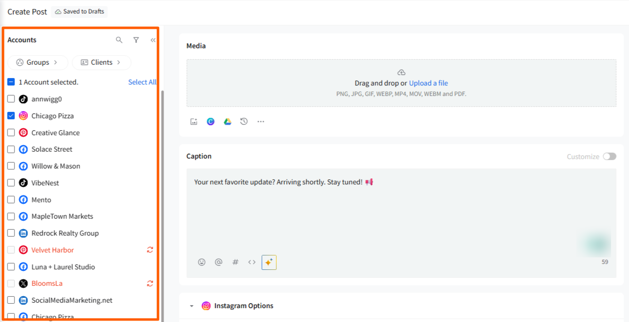- From the left-side Accounts panel, select the Instagram account(s) you want to publish your content to.