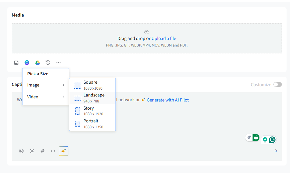 - To create graphics or short visuals, you can also use Canva through the built-in integration. Click the Canva icon, choose Image or Video, and select the size you want to design for. Your Canva file will be added directly to the post.