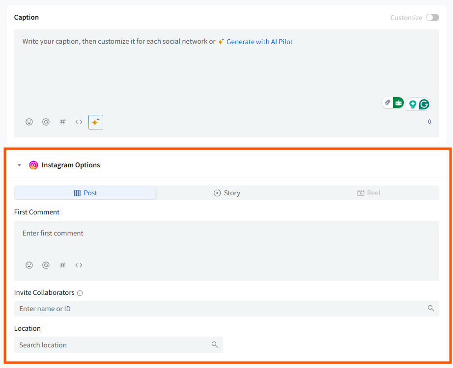 - Go to Platform-specific fields inside the Instagram Options section to select the Post Tab and add-