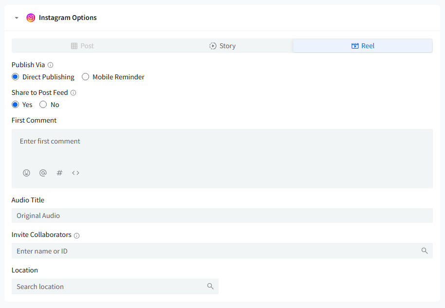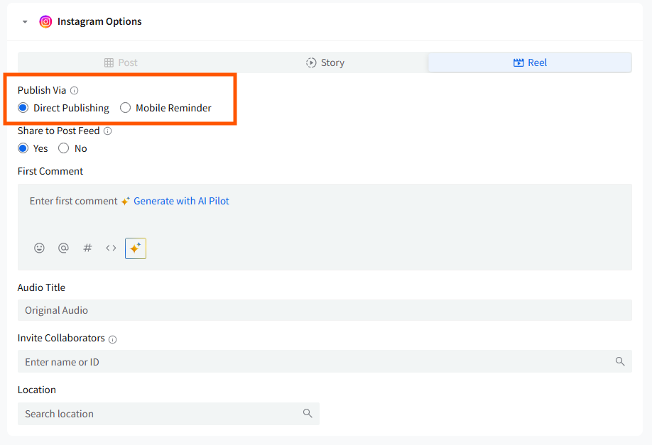 SocialPilot enables direct publishing of Instagram Posts, Stories, and Reels for Business and Creator accounts. For Personal accounts, mobile reminders through the SocialPilot app remain the required publishing method.