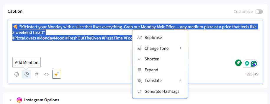 - Tag Instagram accounts by typing @ and selecting from suggestions