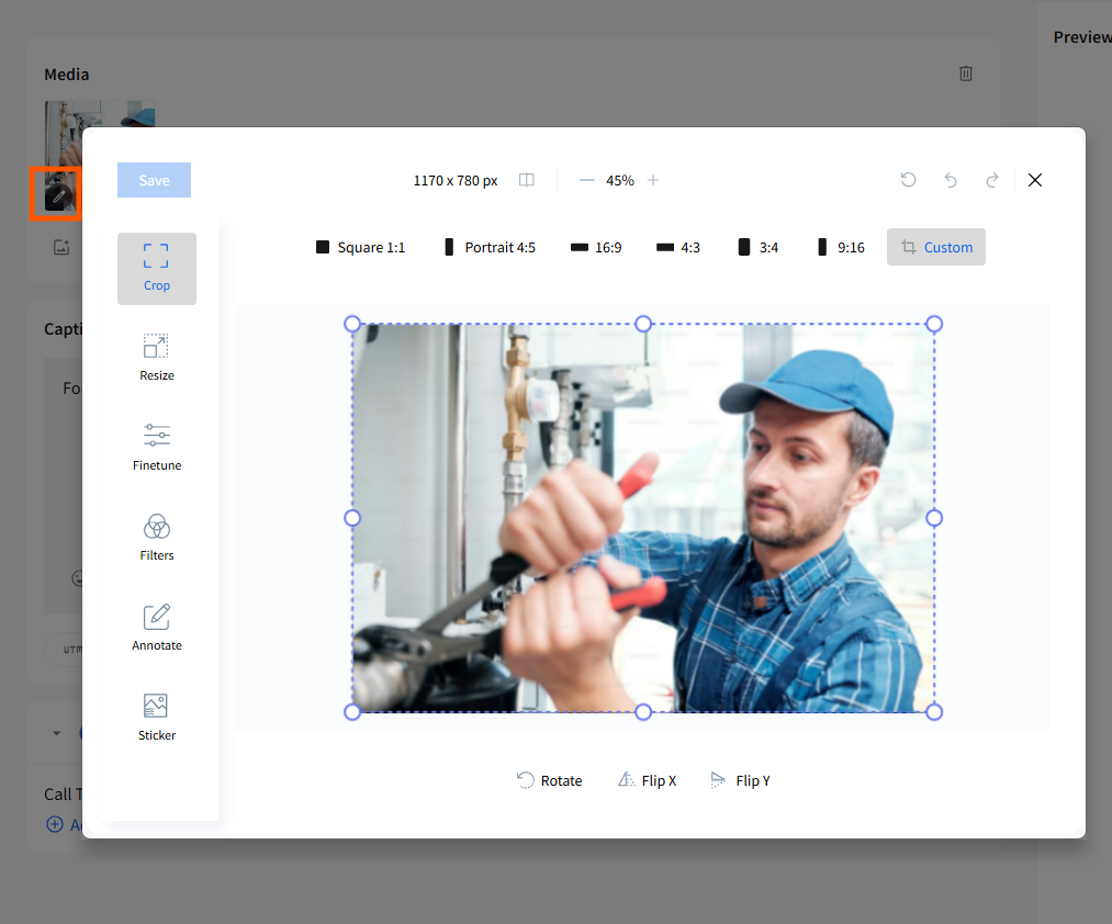 If needed, edit your image using the built-in media editor (crop, resize, filters, etc.).