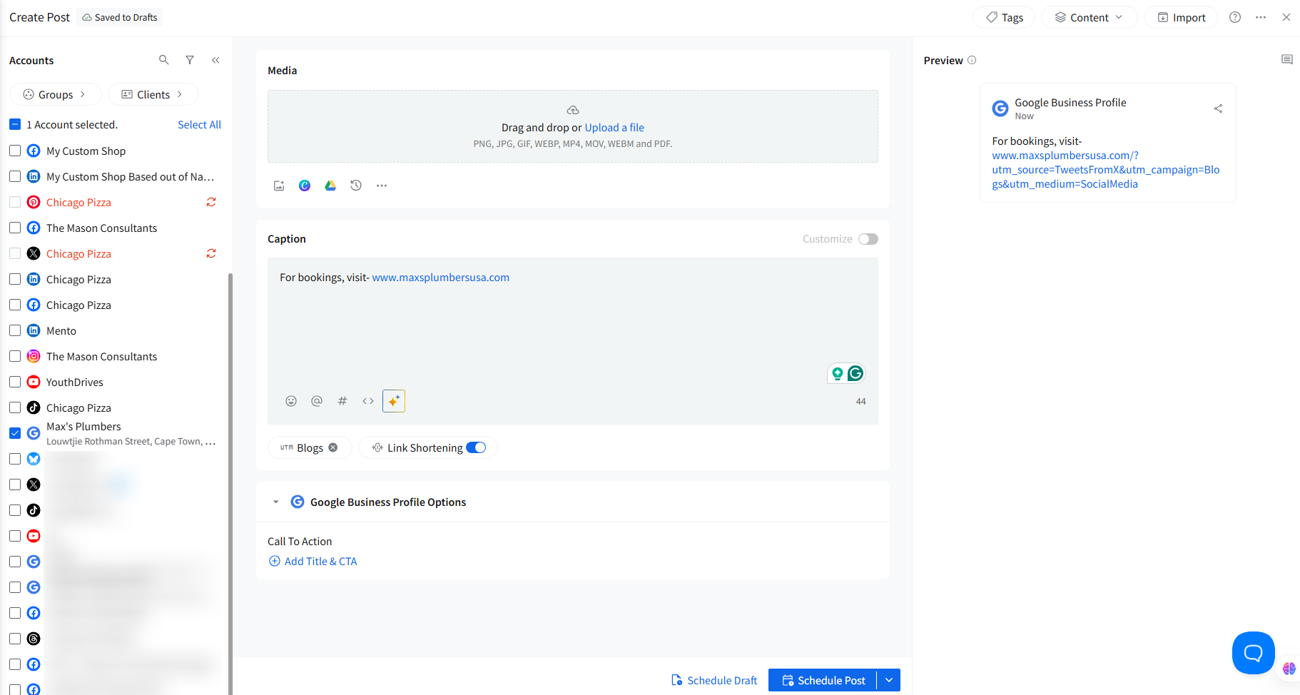 Select your Google Business Profile accounts from the left-side accounts panel and schedule your post using any scheduling option.