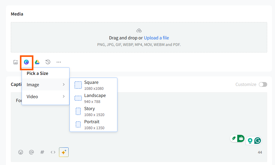 Upload images from your local device, Google Drive, Dropbox, or Box, or create one on Canva by clicking on the Media section at the top of the composer.