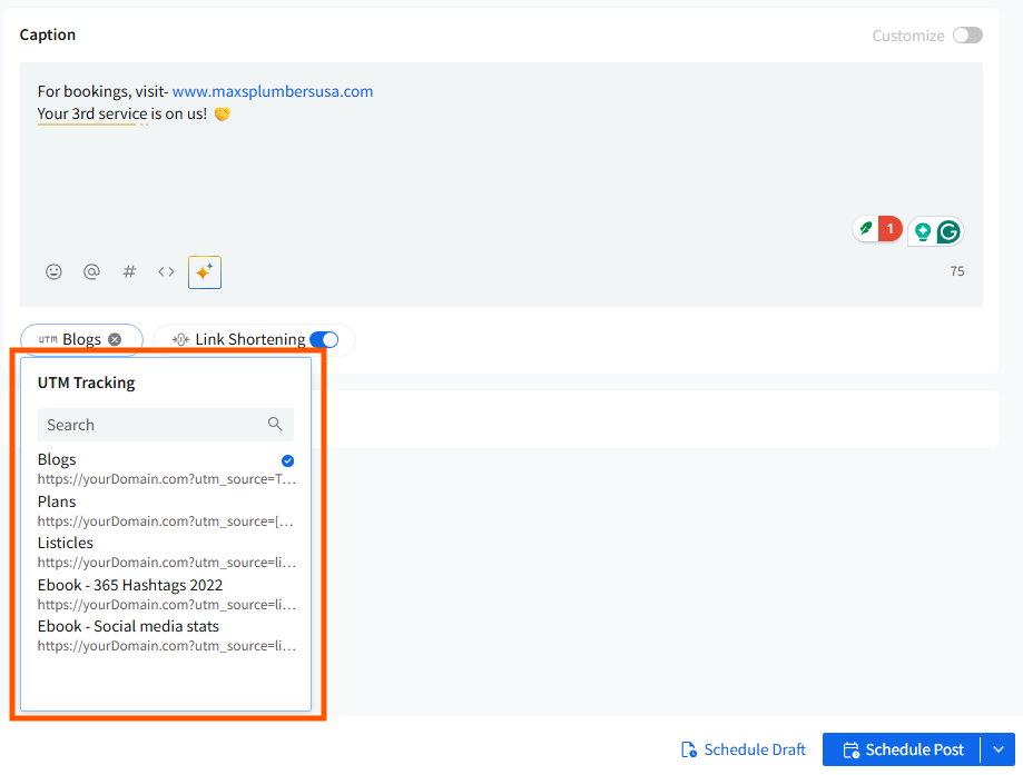 Once selected, the UTM parameter will automatically attach itself to the URL within your caption.