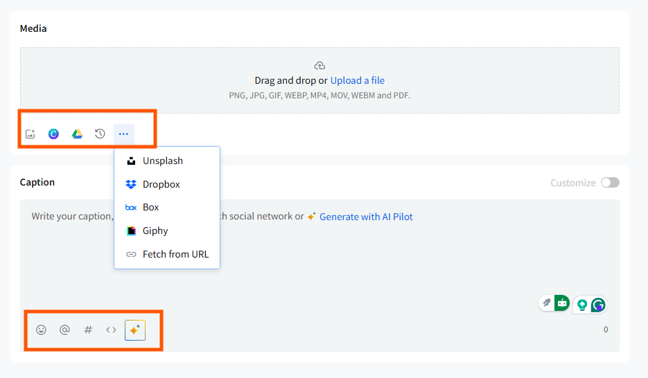 - You can upload images, GIFs, and videos directly from your local computer, Google Drive, Dropbox, or Box by clicking the Add Media button.