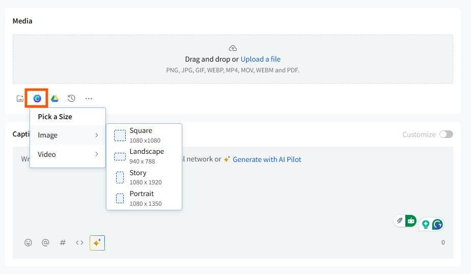 SocialPilot integrates with Canva, allowing you to design custom graphics directly within the post composer. Click the Canva icon inside the Media block, log in with your credentials, and start designing. Once completed, the design will be automatically attached to your post.