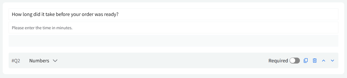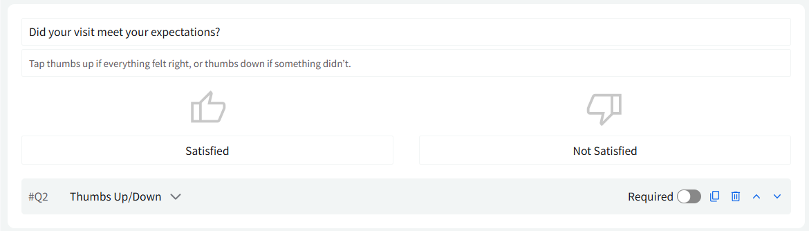 Thumbs Up / Down: This question type shows a thumbs-up and thumbs-down option, allowing customers to quickly indicate a positive or negative experience with a single tap.