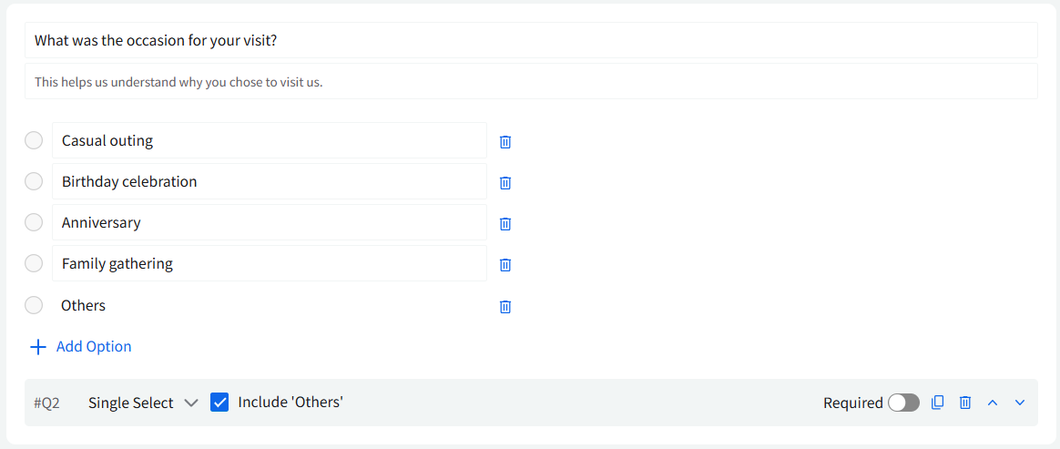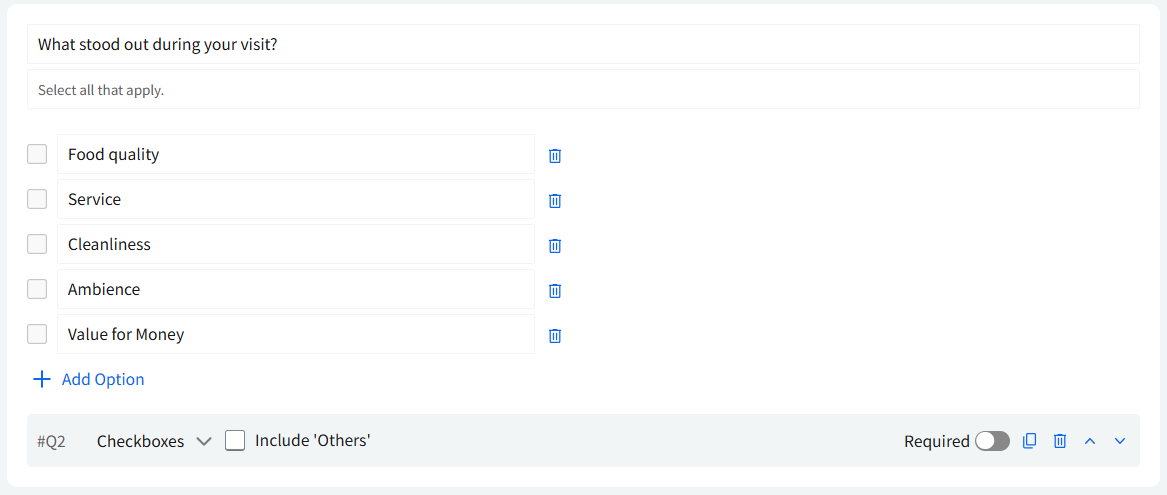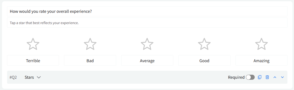 Stars: This question type allows customers to rate their experience using 5-Star ratings, offering a familiar and visual way to collect feedback.