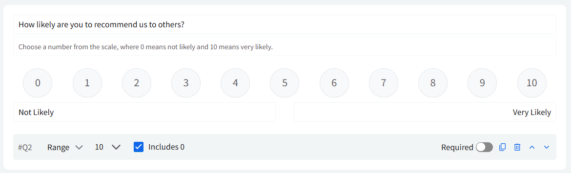 Range: This question type presents a numbered scale that customers can slide or tap through, commonly used to measure likelihood, intensity, or satisfaction levels.