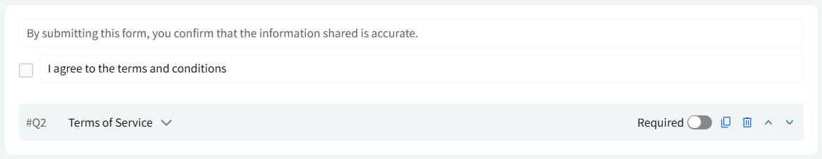 Terms of Service: This field lets you provide reviewers a consent statement with a checkbox that they must agree to before submitting the form.