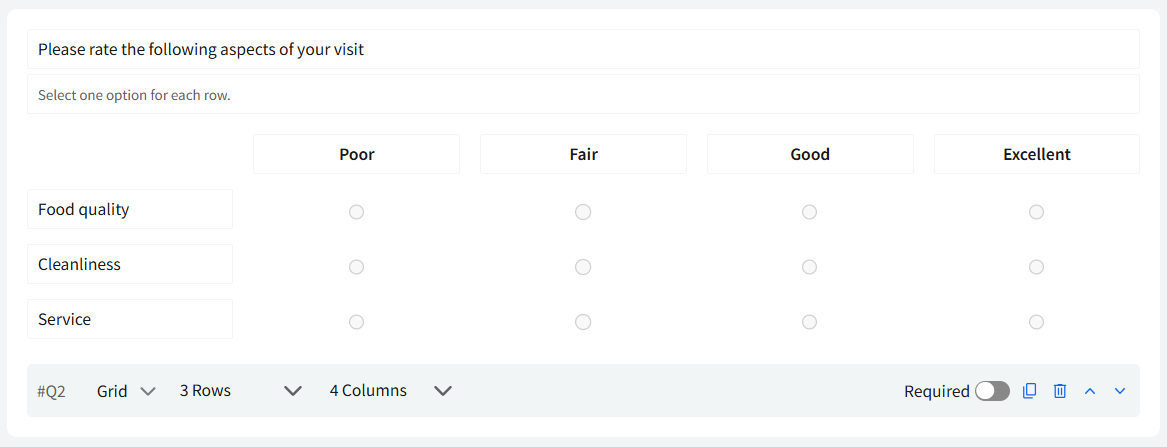 Grid: This field displays rows and columns with selectable options, allowing customers to respond to multiple related items in a structured layout.