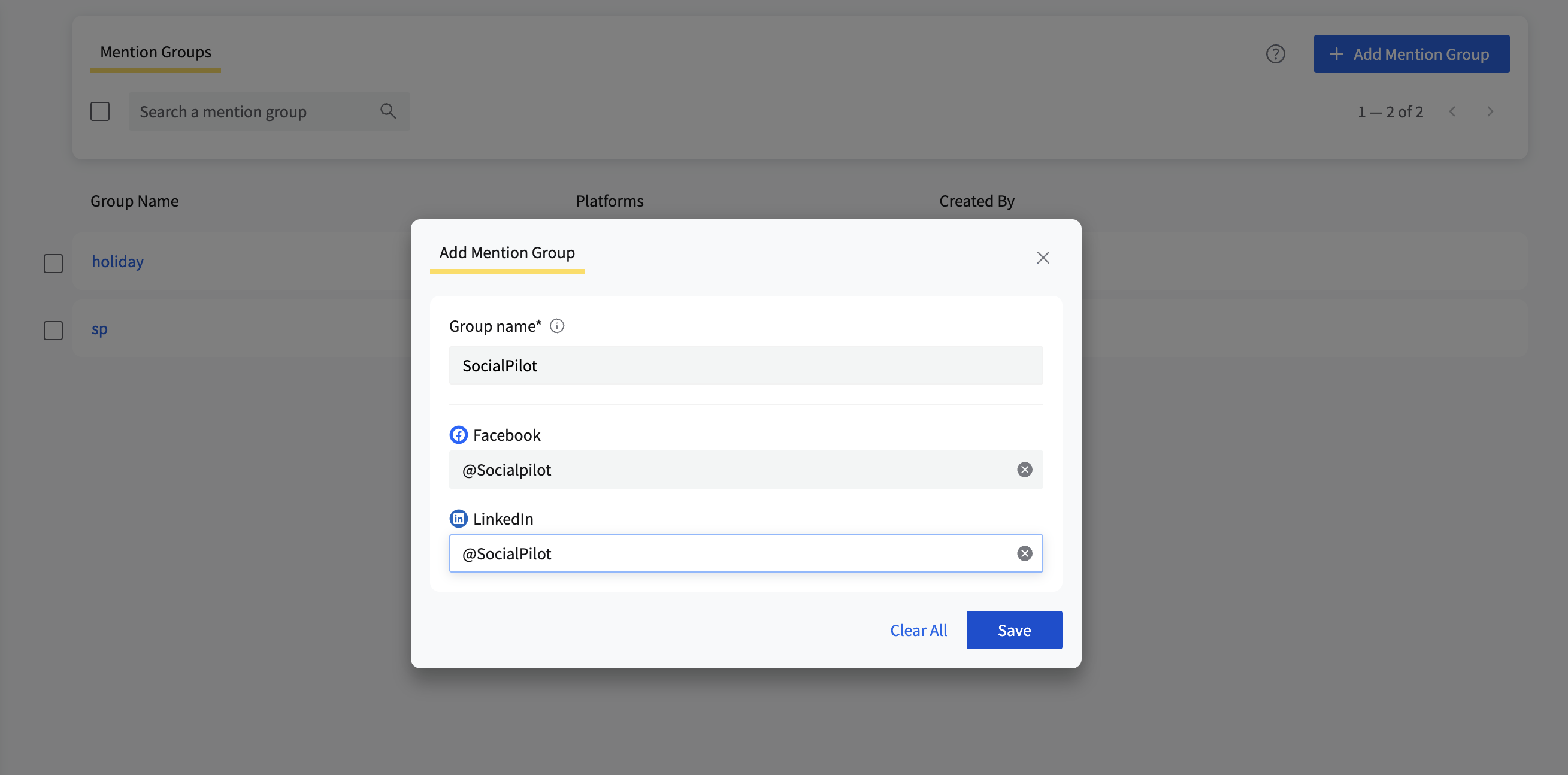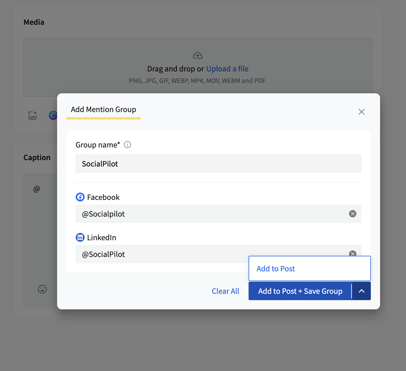 - Or add a New Mention Group and select Add to Post + Save Group.