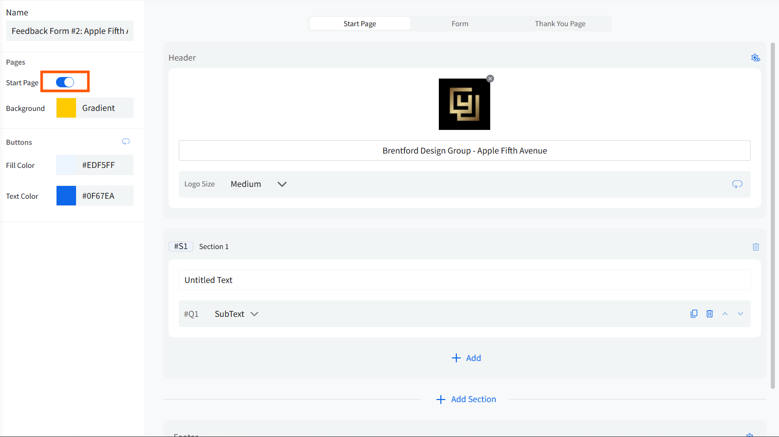 The Start Page is optional and appears before customers begin answering questions. In the left-side panel, you can decide whether to include or exclude it. By default, the toggle for the start page will be turned off.