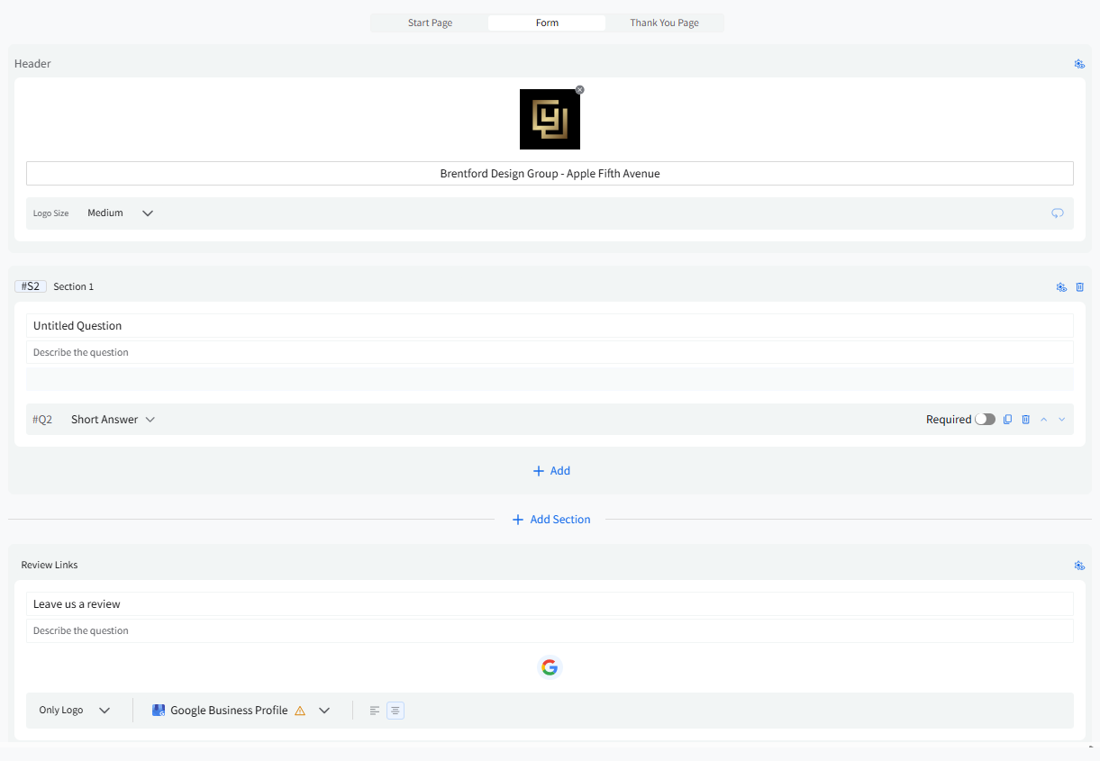 If you choose “Shown only if” or “Hidden only if” for the Review Links section on the Form Page, the Review Links section on the Thank You Page will automatically switch to Always Shown.