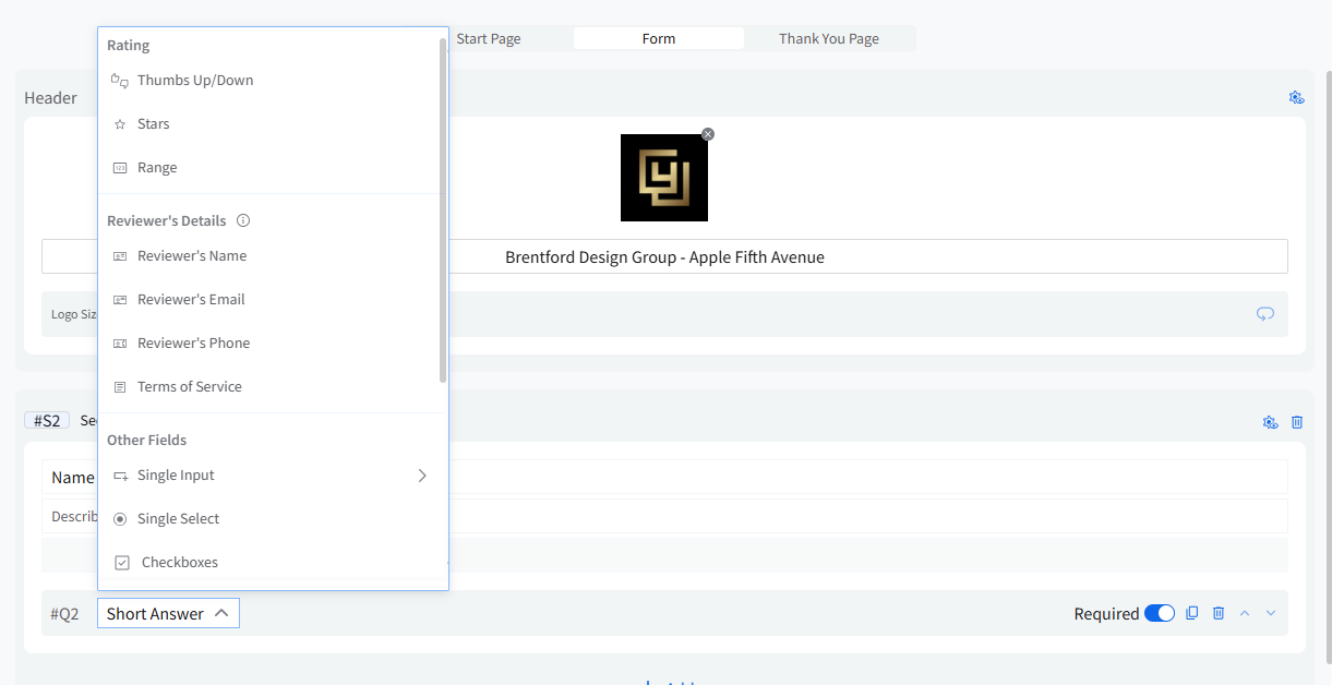 - Select a question type from the drop-down menu, such as rating, short answer, long answer, checkboxes, or drop-down.