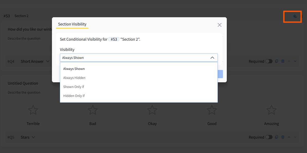 Each section includes visibility settings. This option is available at the top right corner of each section, next to the delete section option.