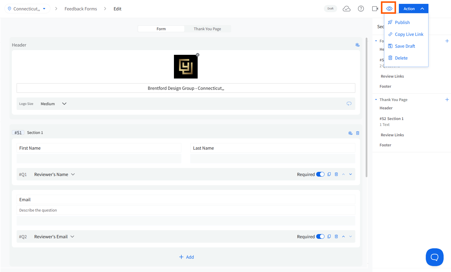 You can click the preview button in the top-right corner, beside the action button, to see how your form will appear to customers and make changes before sending it out if you are not satisfied with anything.