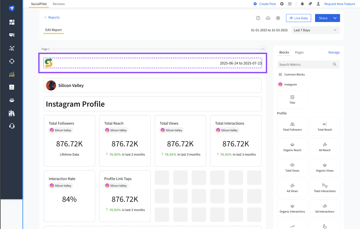 When you view analytics reports on SocialPilot, the date picker at the top of the page lets you filter data by a specific time period such as the last 7 days, last 30 days, or a custom range.