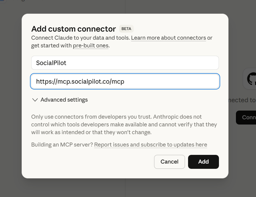 Once connected, your SocialPilot account becomes available inside Claude for execution.